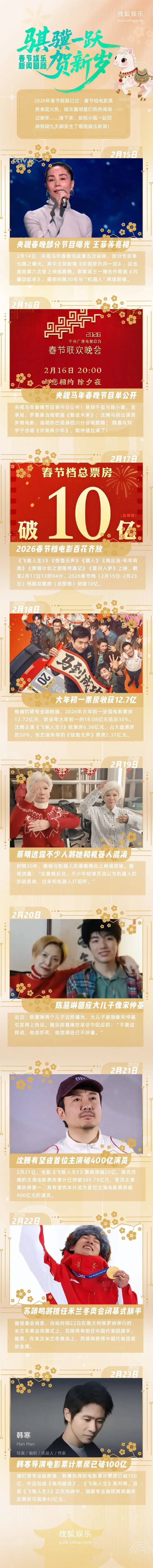 【2026年春节档总票房(含预售)破15亿 《飞驰人生3》领跑 】