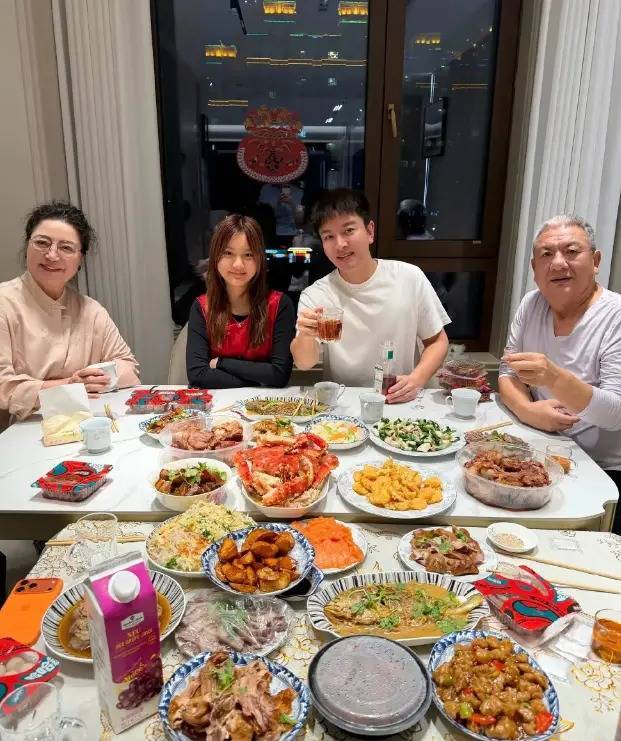 图中可见,女儿甜馨与爸爸一家一同过年。