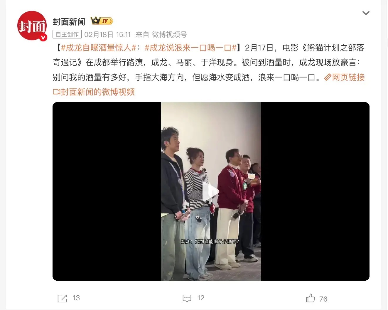 2月17日,电影《熊猫计划之部落奇遇记》在成都举行路演,成龙、马丽、于洋现身。被问到酒量时,成龙现场放豪言:别问我的酒量有多好,手指大海方向,但愿海水变成酒,浪来一口喝一口。