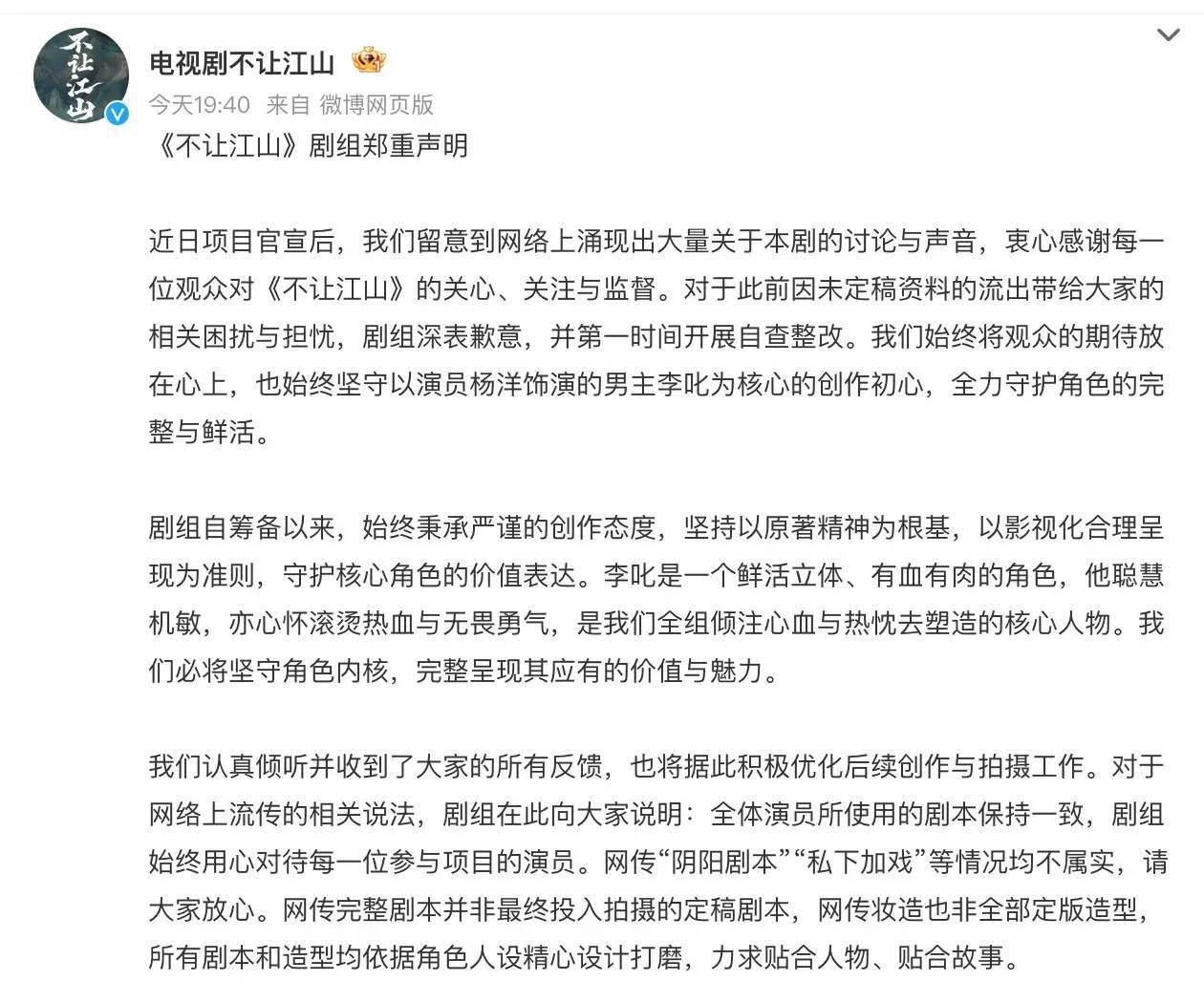 【《不让江山》官方回应剧本争议:始终坚持以杨洋饰演的男主为核心 】
